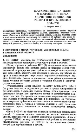 Постановление ЦК ВКП(б). О состоянии и мерах улучшения лекционной работы в Куйбышевской области. 23 августа 1945 г.