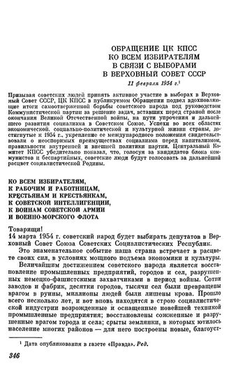 Обращение ЦК КПСС ко всем избирателям в связи с выборами в Верховный совет СССР. Ко всем избирателям, к рабочим и работницам, крестьянам и крестьянкам, к советской интеллигенции, к воинам Советской Армии и Военно-Морского Флота. 11 февраля 1954 г. // Печатается по тексту газеты «Правда», 1954, 11 февраля, № 42.