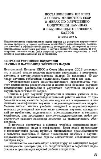Постановление ЦК КПСС и Совета Министров СССР. 13 июня 1961 г. О мерах по улучшению подготовки научных и научно-педагогических кадров // Печатается по тексту документа, хранящегося в ЦПА ИМЛ, ф. 17, оп. 59, д. 404, л . 58—64. (Впервые опубликовано в изложении в газете «Правда», 1961, 17 июня, № 168).