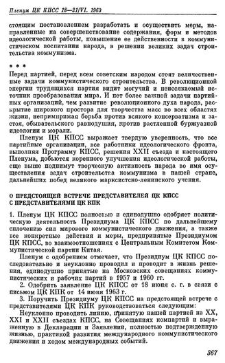 Пленум ЦК КПСС. Москва, 18—21 июня 1963 г. Постановление Пленума. О предстоящей встрече представителей ЦК КПСС с представителями ЦК КПК // Печатается по тексту книги: Пленум Центрального Комитета Коммунистической партии Советского Союза. 18—21 июня 1963 года. Стенографический отчет. М., 1964.