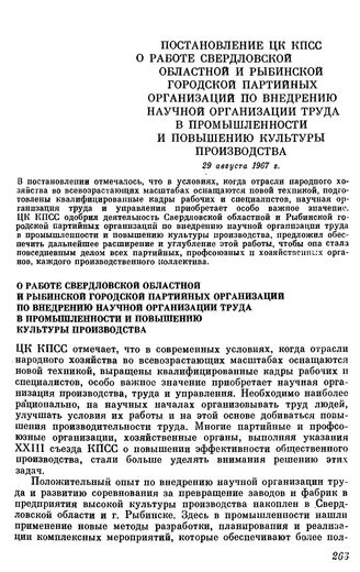 Постановление ЦК КПСС. О работе Свердловской областной и Рыбинской городской партийных организаций по внедрению научной организации труда в промышленности и повышению культуры производства. 29 августа 1967 г. // Печатается по тексту документа, хранящегося в ЦПА ИМЛ, ф. 17, оп. 59, д. 440, л. 3—5. (Впервые опубликовано в изложении в газете «Правда», 1967, 20 сентября, № 263).