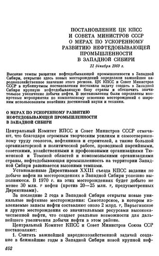 Постановление ЦК КПСС и Совета министров СССР. О мерах по ускоренному развитию нефтедобывающей промышленности в Западной Сибири. 11 декабря 1969 г. // Печатается по тексту документа, хранящегося в ЦПА ИМЛ, ф. 17, оп. 59, д. 407, л. 201—212. (Впервые опубликовано в изложении в газете «Правда», 1970, 15 января, № 15).