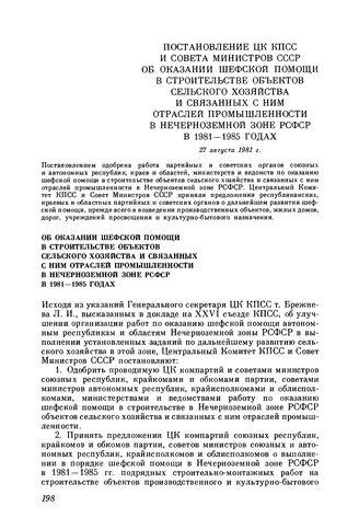 Постановление ЦК КПСС и Совета Министров СССР Об оказании шефской помощи в строительстве объектов сельского хозяйства и связанных с ним отраслей промышленности в Нечерноземной зоне РСФСР в 1981—1985 годах. 27 августа 1981 г.