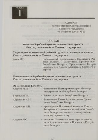 Состав совместной рабочей группы по подготовке проекта Конституционного Акта Союзного государства. Одобрен постановлением Совета Министров Союзного государства от 8 октября 2001 г. № 20