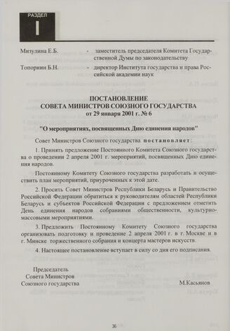 Постановление Совета Министров Союзного государства от 29 января 2001 г. № 6 "О мероприятиях, посвященных Дню единения народов"