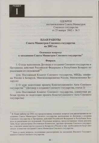 План работы Совета Министров Союзного государства на 2002 год. Одобрен постановлением Совета Министров Союзного государства от 25 января 2002 г. № 5