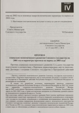 Прогноз социально-экономического развития Союзного государства на 2001 год и параметры прогноза на период до 2003 года. Одобрен постановлением Совета Министров Союзного государства от 15 мая 2001 г. № 8