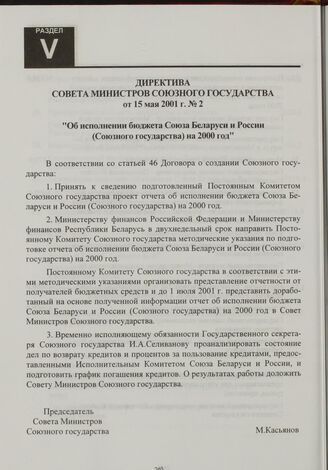 Директива Совета Министров Союзного государства от от 15 мая 2001 г. № 2 ”Об исполнении бюджета Союза Беларуси и России (Союзного государства) на 2000 год"