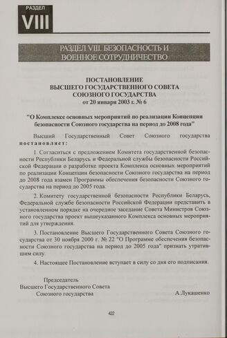 Постановление Высшего Государственного Совета Союзного государства от 20 января 2003 г. № 6 "О Комплексе основных мероприятий по реализации Концепции безопасности Союзного государства на период до 2008 года"