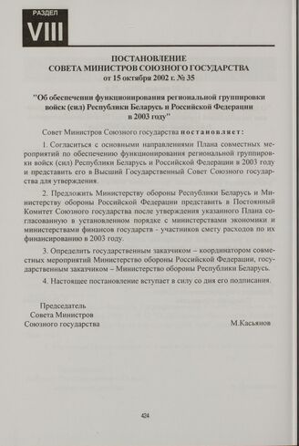 Постановление Совета Министров Союзного государства от 15 октября 2002 г. № 35 "Об обеспечении функционирования региональной группировки войск (сил) Республики Беларусь и Российской Федерации в 2003 году"