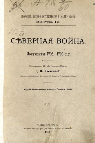 Сборник военно-исторических материалов. Вып. I-й. Северная война. Док. 1705-1708 г.г. / Воен.-Учен. Ком. Глав. Штаба; Сост. Д.Ф. Масловский. — СПб.: Воен. тип. Глав. штаба, 1892. — 452 с.