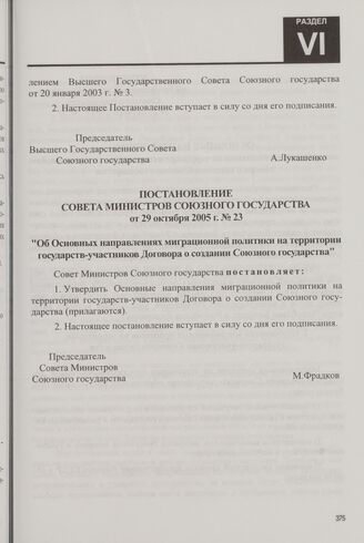Постановление Совета Министров Союзного государства от 29 октября 2005 г. № 23 "Об Основных направлениях миграционной политики на территории государств-участников Договора о создании Союзного государства"