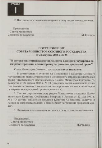 Постановление Совета Министров Союзного государства от 24 августа 2006 г. № 28 "О составе совместной коллегии Комитета Союзного государства по гидрометеорологии и мониторингу загрязнения природной среды"