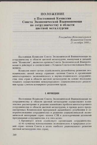 Положение о Постоянной Комиссии Совета Экономической Взаимопомощи по сотрудничеству в области цветной металлургии. Утверждено Исполнительным Комитетом Совета 25 октября 1980 г.