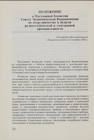 Положение о Постоянной Комиссии Совета Экономической Взаимопомощи по сотрудничеству в области радиотехнической и электронной промышленности. Утверждено Исполнительным Комитетом Совета 25 октября 1980 г.