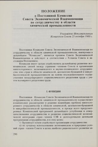 Положение о Постоянной Комиссии Совета Экономической Взаимопомощи по сотрудничеству в области химической промышленности. Утверждено Исполнительным Комитетом Совета 25 октября 1980 г.