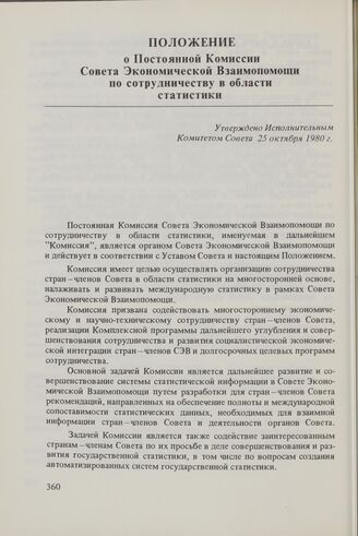 Положение о Постоянной Комиссии Совета Экономической Взаимопомощи по сотрудничеству в области статистики. Утверждено Исполнительным Комитетом Совета 25 октября 1980 г.