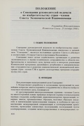 Положение о Совещании руководителей ведомств по изобретательству стран - членов Совета Экономической Взаимопомощи. Утверждено Исполнительным Комитетом Совета 25 октября 1980 г.
