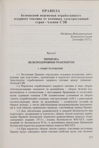 Правила безопасной перевозки отработавшего ядерного топлива от атомных электростанций стран-членов СЭВ. Одобрены Исполнительным Комитетом Совета 23 ноября 1977 г. Перевозка железнодорожным транспортом. Общие положения