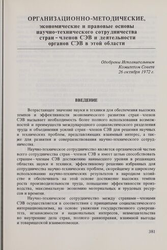 Организационно-методические, экономические и правовые основы научно-технического сотрудничества стран-членов СЭВ и деятельности органов СЭВ в этой области. Одобрены Исполнительным Комитетом Совета 26 октября 1972 г. Введение