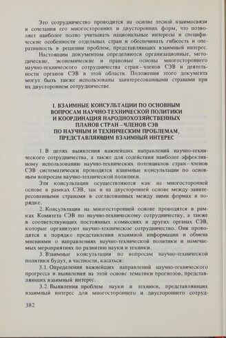 Организационно-методические, экономические и правовые основы научно-технического сотрудничества стран-членов СЭВ и деятельности органов СЭВ в этой области. Одобрены Исполнительным Комитетом Совета 26 октября 1972 г. Взаимные консультации по основным вопросам научно-технической политики и координация народнохозяйственных планов стран-членов СЭВ по научным и техническим проблемам, представляющим взаимный интерес