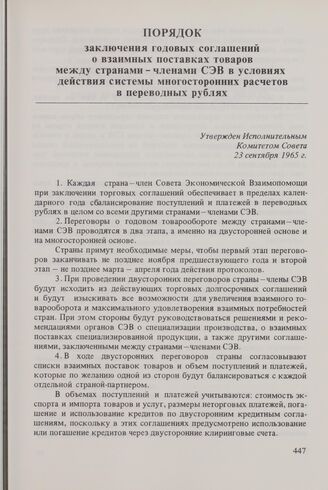 Порядок заключения годовых соглашений о взаимных поставках товаров между странами-членами СЭВ в условиях действия системы многосторонних расчетов в переводных рублях. Утвержден Исполнительным Комитетом Совета 23 сентября 1965 г.