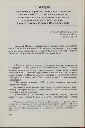 Порядок подготовки и рассмотрения постоянными комиссиями СЭВ смежных вопросов экономического и научно-технического сотрудничества стран-членов Совета Экономической Взаимопомощи. Утвержден Исполнительным Комитетом Совета 24 июля 1970 г.