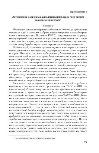 Приложение 1 к сопроводительному письму А. Михалкова-Кончаловского от 3 января 1979 г. Активизация роли кино в идеологической борьбе двух систем на современном этапе // Ф. 5. Оп. 76. Д. 294. Л. 3-26. Подлинник.