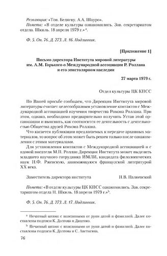 Приложение 1 к записке Посольства СССР во Франции от 6 февраля 1979 г. Письмо директора Института мировой литературы им. А.М. Горького о Международной ассоциации Р. Роллана и его эпистолярном наследии. 27 марта 1979 г. // Ф. 5. Оп. 76. Д. 273. Л. 17. Подлинник.