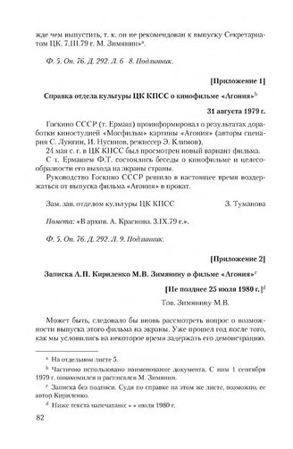 Приложение 1 к записке Госкино СССР от 6 марта 1979 г. Справка отдела культуры ЦК КПСС о кинофильме «Агония». 31 августа 1979 г.