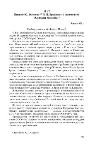 Письмо Ю. Озерова Л.И. Брежневу о киноэпопее «Солдаты свободы». 15 мая 1979 г.