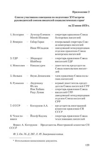 Приложение 2 к сопроводительной записке правления Союза писателей СССР от 22 июня 1979 г. Список участников совещания по подготовке XVI встречи руководителей союзов писателей социалистических страна. на 22 июня 1979 г. // Ф. 5. Оп. 76. Д. 287. Л. 49. Заверенная копия.