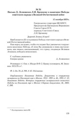 Приложение к письму Д. Лелюшенко Л.И. Брежневу от 17 октября 1979 г. Записка отдела культуры ЦК КПСС о сооружении Памятника Победы в Москве. 21 ноября 1979 г. // Ф. 5. Оп. 76. Д. 290. Л. 68. Подлинник.