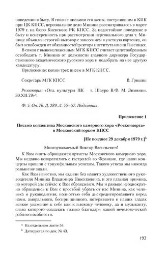 Приложение 1 к записке секретаря Московского горкома КПСС от 29 декабря 1979 г. Письмо коллектива Московского камерного хора «Росконцерта» в Московский горком КПСС. [Не позднее 29 декабря 1979 г.] // Ф. 5. Оп. 76. Д. 289. Л. 58-60. Копия.