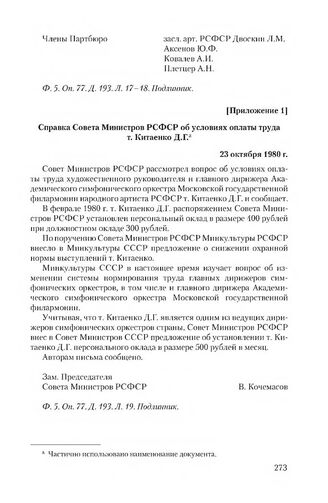 Приложение 1 к письму коллектива Академического симфонического оркестра Московской государственной филармонии от 31 марта 1980 г. Справка Совета Министров РСФСР об условиях оплаты труда т. Китаенко Д.Г. 23 октября 1980 г.