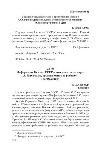 Приложение 2 к записке Госкино СССР от 16 мая 1980 г. Справка отдела культуры о предложении Госкино СССР по представительству Всесоюзного объединения «Совэкспортфильм» в ДРА. 12 июня 1980 г.