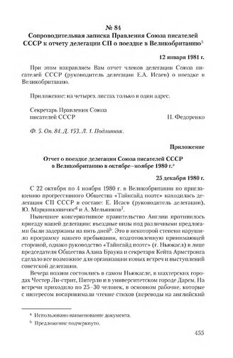 Приложение к сопроводительной записке Правления Союза писателей СССР от 12 января 1981 г. Отчет о поездке делегации Союза писателей СССР в Великобританию в октябре-ноябре 1980 г. 25 декабря 1980 г. // Ф. 5. Оп. 84. Д. 153. Л. 2-5. Подлинник.