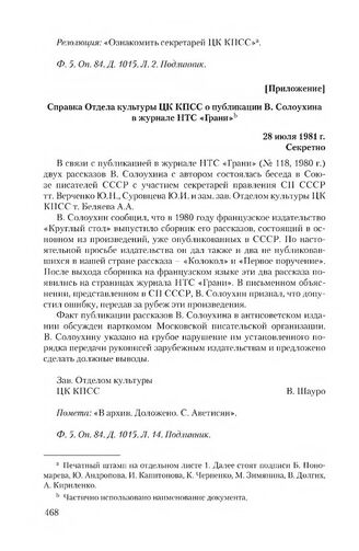 Приложение к информации КГБ СССР от 10 марта 1981 г. Справка Отдела культуры ЦК КПСС о публикации В. Солоухина в журнале НТС «Грани». 28 июля 1981 г.