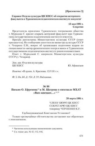 Приложение 1 к письму Туркменского театрального общества от 16 марта 1981 г. Справка Отдела культуры ЦК КПСС об открытии актерского факультета в Туркменском педагогическом институте искусств. 13 мая 1981 г.