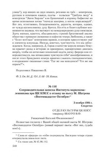 Сопроводительная записка Института марксизма-ленинизма при ЦК КПСС к отзыву на пьесу М. Шатрова «Восемнадцатое Октября». 3 ноября 1981 г.