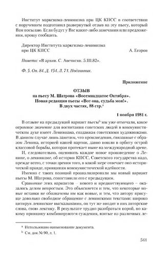 Приложение к сопроводительной записке Института марксизма-ленинизма при ЦК КПСС от 3 ноября 1981 г. Отзыв на пьесу М. Шатрова «Восемнадцатое Октября». Новая редакция пьесы «Вот она, судьба моя!». В двух частях, 88 стр. 1 ноября 1981 г.