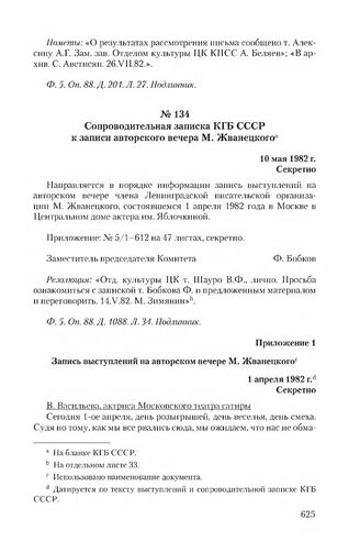 Сопроводительная записка КГБ СССР к записи авторского вечера М. Жванецкого. 10 мая 1982 г. // Ф. 5. Оп. 88. Д. 1088. Л. 34. Подлинник.