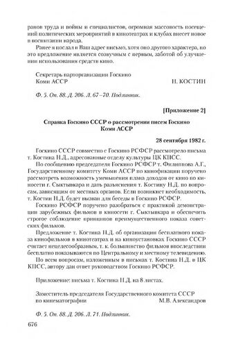 Приложение 2 к письму Сыктывкарской городской дирекции киносети от 19 августа 1982 г. Справка Госкино СССР о рассмотрении писем Госкино Коми АССР. 28 сентября 1982 г.