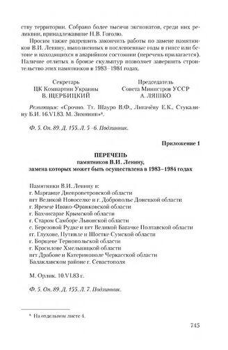 Приложение 1 к записке ЦК КП Украины и Совета Министров Украинской ССР от 10 июня 1983 г. Перечень памятников В.И. Ленину, замена которых может быть осуществлена в 1983-1984 годах // Ф. 5. Оп. 89. Д. 155. Л. 7. Подлинник.