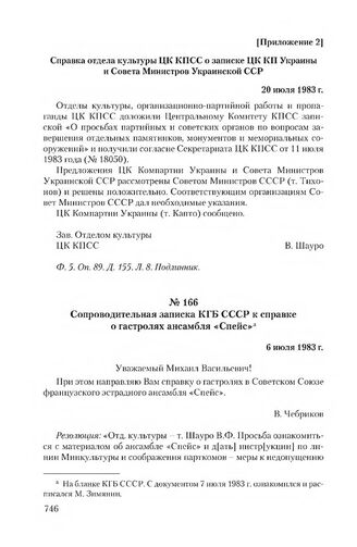 Приложение 2 к записке ЦК КП Украины и Совета Министров Украинской ССР от 10 июня 1983 г. Справка отдела культуры ЦК КПСС о записке ЦК КП Украины и Совета Министров Украинской ССР. 20 июля 1983 г. // Ф. 5. Оп. 89. Д. 155. Л. 8. Подлинник.