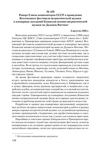 Рапорт Союза композиторов СССР о проведении Всесоюзного фестиваля патриотической музыки и пленарных заседаний Комиссии военно-патриотической музыки на Дальнем Востоке. 3 августа 1983 г. // Ф. 5. Оп. 89. Д. 154. Л. 49-51. Подлинник.