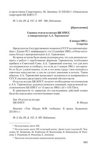 Приложение к информации Госкино СССР от 19 декабря 1983 г. Справка отдела культуры ЦК КПСС о кинорежиссере А.А. Тарковском. 6 января 1984 г.