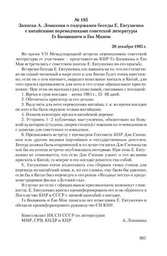 Записка А. Ломакина о содержании беседы Е. Евтушенко с китайскими переводчиками советской литературы Гэ Баоцюанем и Гао Маном. 30 декабря 1983 г.