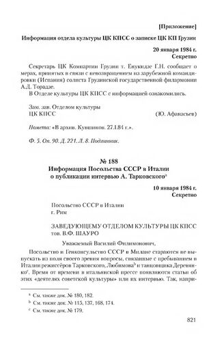 Приложение к записке ЦК КП Грузии от 9 января 1984 г. Информация отдела культуры ЦК КПСС о записке ЦК КП Грузии. 20 января 1984 г.