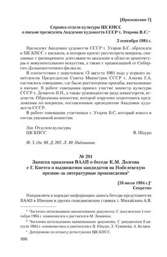 Приложение 7 к записке Академии художеств СССР от 23 июля 1984 г. Справка отдела культуры ЦК КПСС о письме президента Академии художеств СССР т. Угарова В.С. 3 сентября 1984 г. // Ф. 5. Оп. 90. Д. 207. Л. 40. Подлинник.